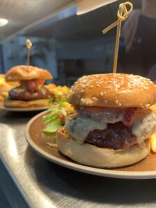 Beef or Chicken burgers are topped with bacon, cheddar, crispy onions, gherkin & chilli jam
